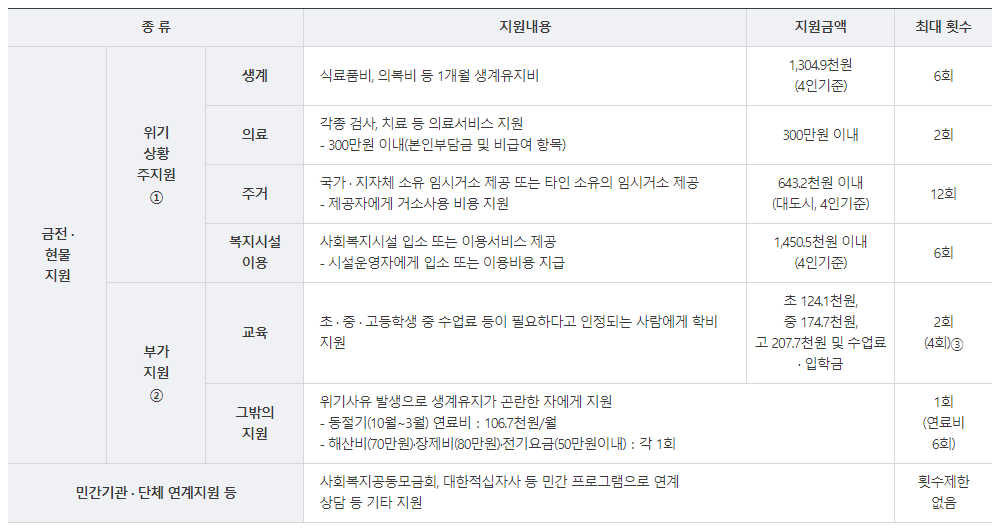긴급복지지원은 크게는 금전과 현물지원, 민간기관 및 단체 연계지원 등으로 구분됩니다. 금전과 현물지원은 위기상황 주지원과 부가지원으로 세분화됩니다. 위기상황 주지원은 생계, 의료, 주거, 복지시설 이용으로 구분됩니다. 부가지원은 교육과 그 밖의 지원으로 세분화됩니다. 생계 지원은 식료품비와 의복비 등 1개월 생계유지비 1,304.9천 원(4인 가구기준)이 지원되고, 최대 6회까지 가능합니다. 나머지 지원내용은 아래 그림을 참고하시면 됩니다. 부가지원 중 교육은 초 · 중 · 고등학생 중 수업료 등의 필요하다고 인정되는 사람에게 학비를 지원합니다. 초등학생은 124.1천원, 중학생은 174.7천 원, 고등학생은 207.7천 원 및 수업료와 입학금이 최대 2회까지 지원됩니다. 나머지 부가지원 내용은 그림의 내용을 참조하시길 바랍니다.