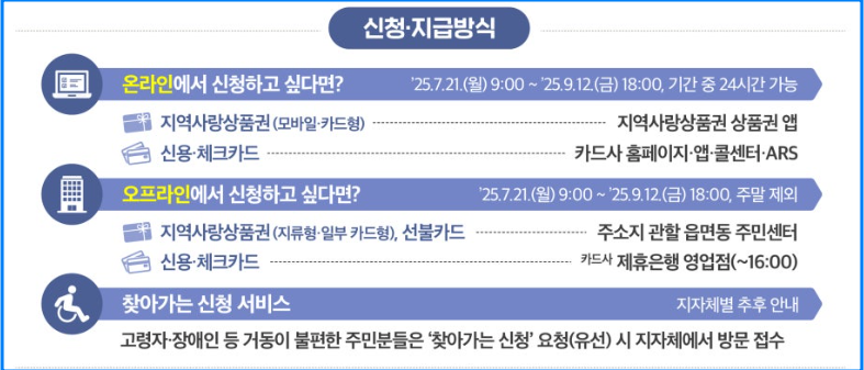 온라인에서는 지역사랑상품권(모바일, 카드형) 또는 신용 및 체크카드로 신청을 하시면 됩니다.