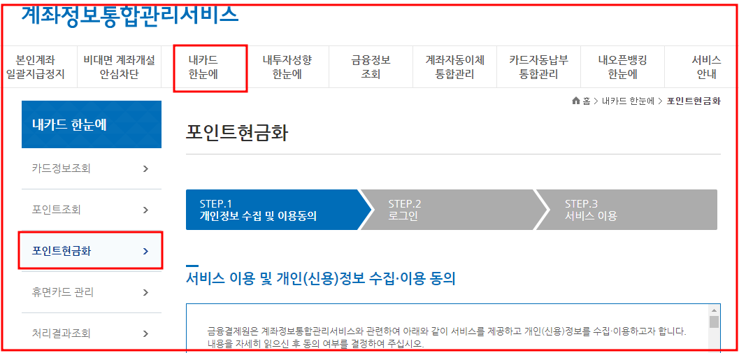 • (1단계) 계좌정보통합관리서비스 사이트 접속 → 내카드 한눈에 → 포인트 현금화 클릭