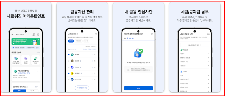 모바일에서 간편하게 이용하고 싶다면 어카운트인포 앱을 추천드립니다. 금융결제원이 운영하는 공식 앱으로, 스마트폰 인증만으로 간단하게 접속할 수 있다는 장점이 있습니다. 이 앱은 위에서 소개드린 계좌정보통합관리 사이트의 앱 버전이라도 이해하시면 됩니다.