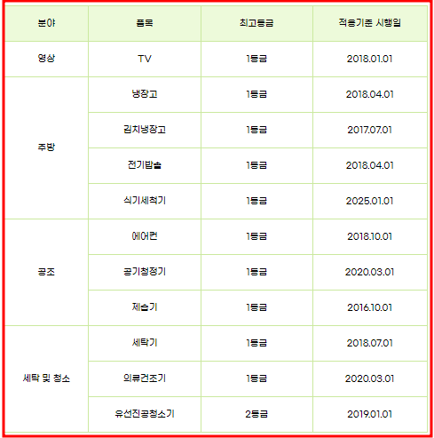 • (환급 대상) 통상 효율등급제도에서 관리하는 11개 가전의 최상위 등급 제품입니다. 에너지소비효율소비등급 라벨을 보면 통상 등급이 나옵니다. 유선진공청소기 2등급을 빼고 대부분 1등급 제품이 해당됩니다.