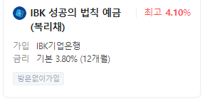 5대 은행에 대해서는 소개해드렸고, IBK의 경우 최고금리 4.10%의 예금도 있습니다. 게다가 복리채입니다. 이러한 상품들도 관심을 두시면 좋을 것 같습니다.