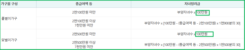 소득 요건은 자녀장려금의 경우 홑벌이가구는 연간총급여액 등이 4~7,000만 원 이하, 맞벌이가구는 연간총급여액 등이 600~7000만 원이하입니다. 여기서 총 급여액 등은 거주자 및 배우자가 근로(총 급여액), 사업소득(사업수입금액 ×업종별 조정률), 종교인소득(총수입금액)을 합한 금액입니다.