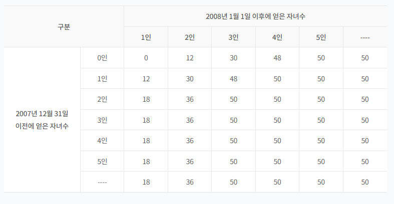 자녀가 2명이면 12개월, 자녀가 3명 이상이면 둘째 자녀에 인정되는 12개월에 셋째 자녀 이상 1명마다 18개월을 추가하여 최장 50개월까지 가입기간을 추가로 인정해 줍니다. 여기에 소요되는 비용은 국가가 전부 또는 일부를 부담해주고 있습니다. 다자녀를 계획 중이신 분들은 잘 알아두셔야 합니다.