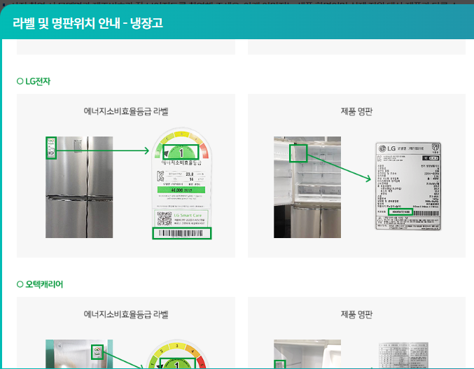 위의 지원품목 중 냉장고를 눌러주면 다음과 같이 LG전자 냉장고의 라벨 및 명판 위치 등을 확인할 수 있습니다. 에너지소비효율등급과 적용기준시행일을 확인할 수 있는 위치는 오른쪽 그림과 같습니다. 따라서 신청을 하시는 분은 모델명과 제조번호가 잘 보이도록 에너지소비효율등급라벨과 제품 명판을 촬영해 놓으셔야 합니다.