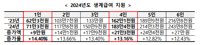생계급여는 1인가구 기준 9만 원(14.4%)이 인상되며, 4인가구 기준 2023년 162만 1천 원에서 2024년 183만 4천 원으로 21만 3천 원가량 인상된다고 합니다. 전년 대비 13.16%가 증가하는 셈입니다. 이는 지난 5년 간(2018~2022) 전체 증가분 19만 6천 원 보다도 많은 금액으로 기초수급자에게는 반가운 소식입니다.