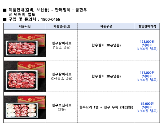 기간이 2월 16일까지로 넉넉하게 잡고 있는 것으로 판단됩니다. 구이용 구입 및 문의처는 신선피엔에프와 더조아, 기타 한우 가공식품은 창운, 갈비와 보신용은 품한우로 위 표에 있는 연락처를 참고하시면 됩니다. 가격은 아래 구이용, 가공식품, 갈비 및 보신용에 대해 각각 표시되어 있습니다.
